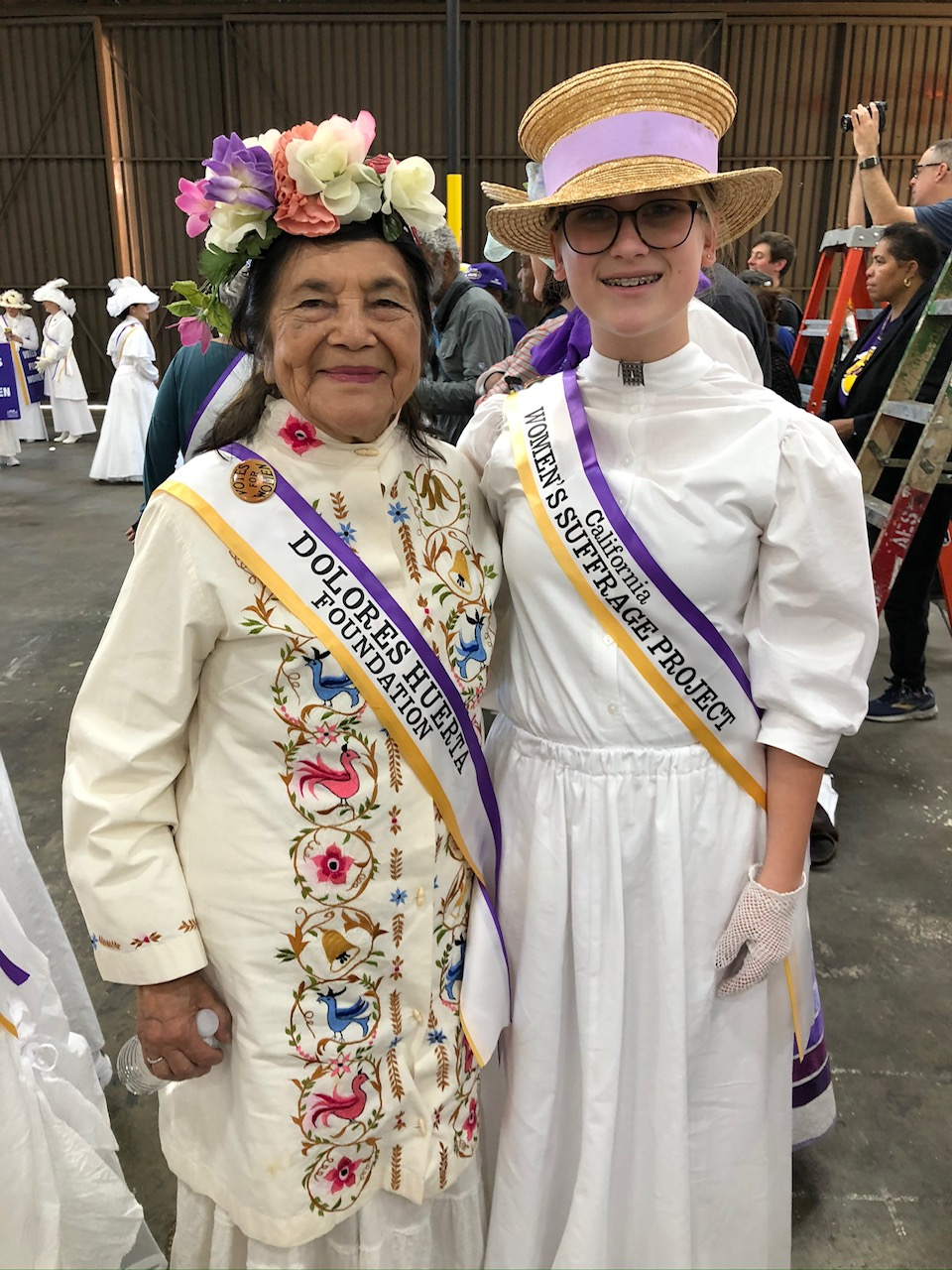 Dolores Huerta rode on the Rose Parade float. She is pictured with NWHA Youth Advisory Board leader Geneva Williams who was one of 100 women who dressed as suffragists as outwalkers behind the float.